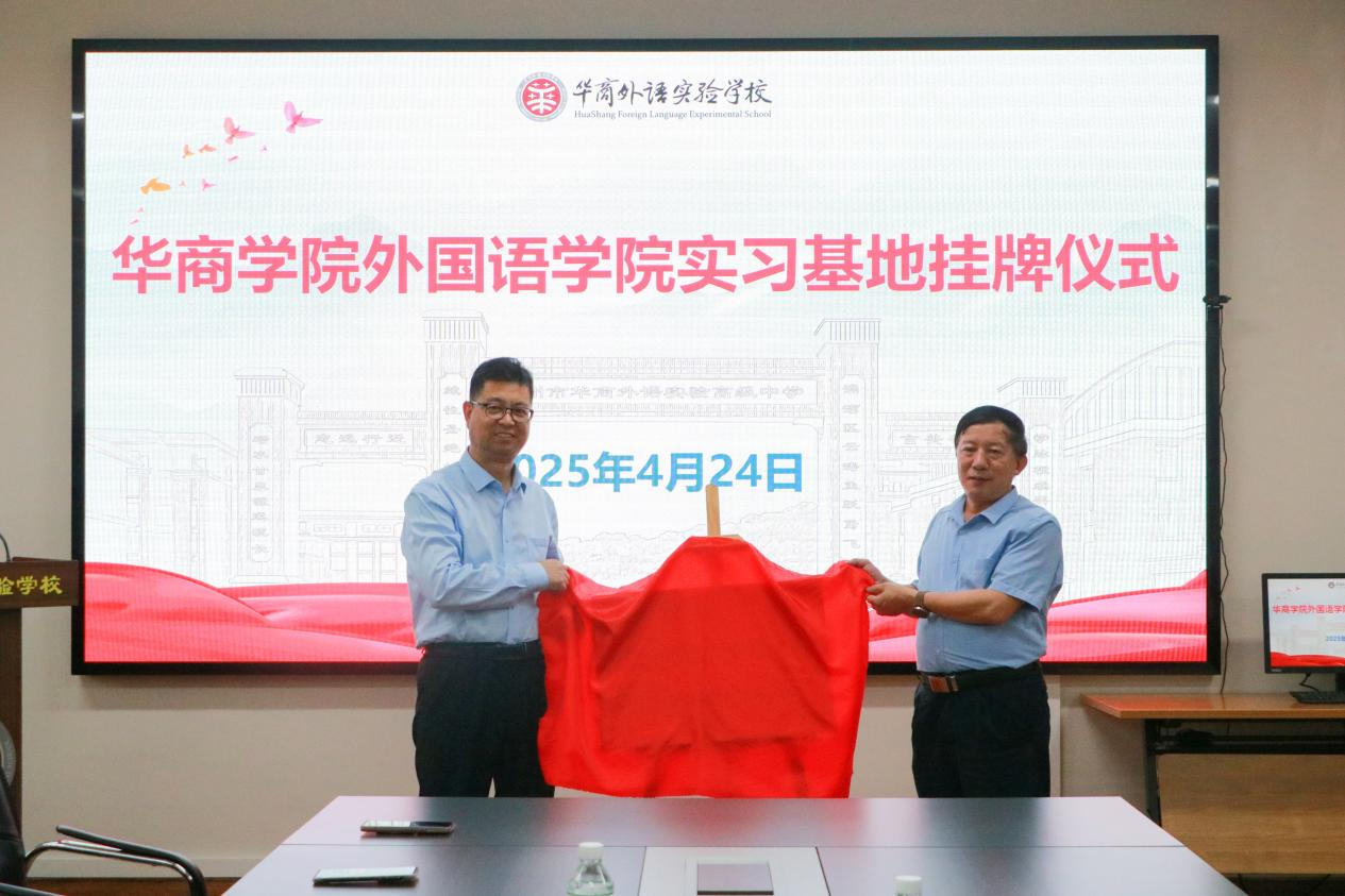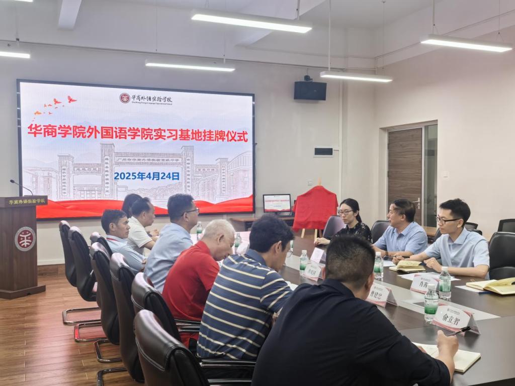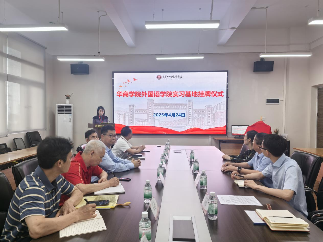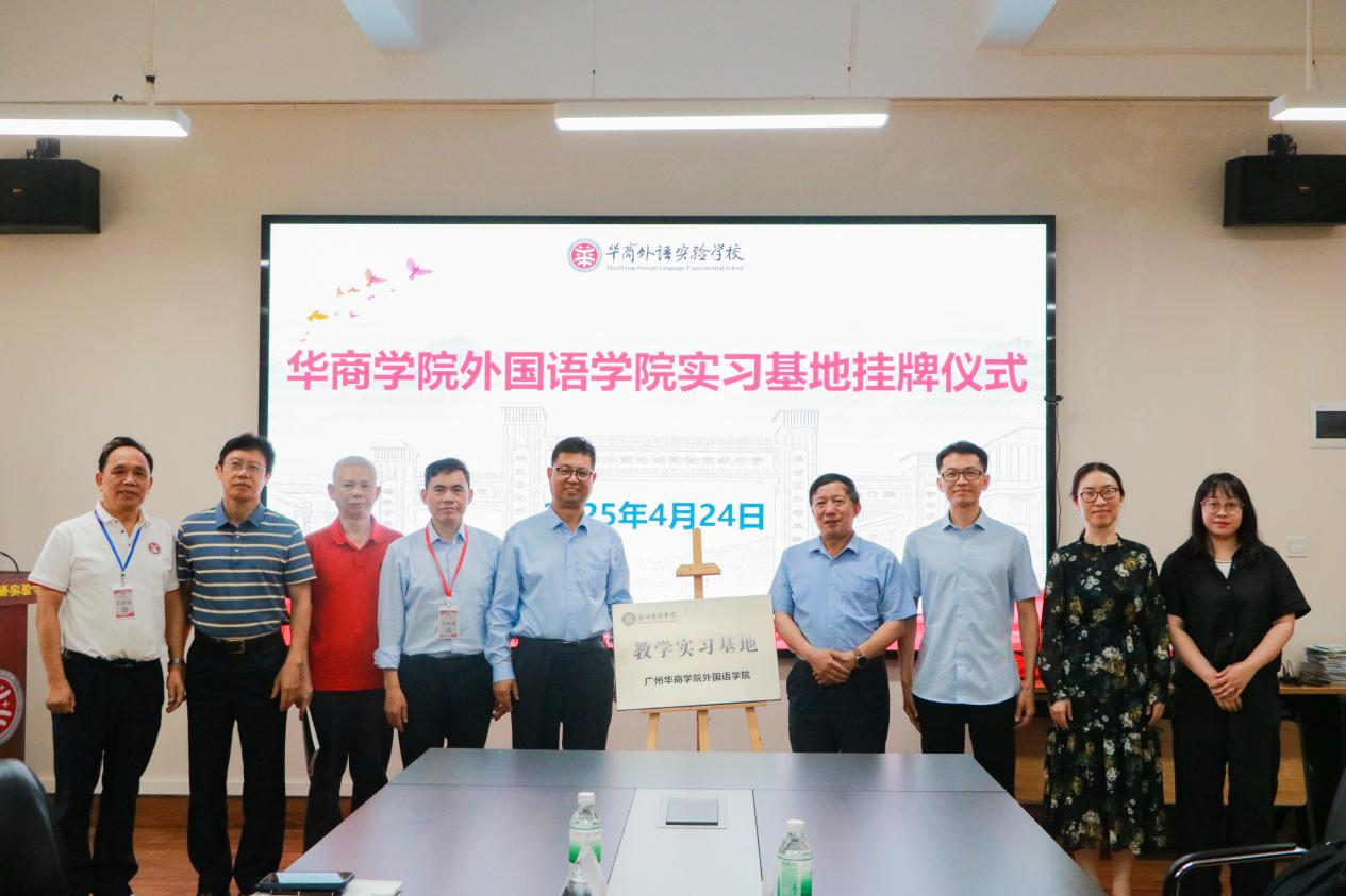 2025年4月24日下午,广州太阳成集团tyc122cc入口外国语学院一行前往广州市华商外语实验学校,举行共建实习基地挂牌仪式。出席此次活动的有华商外语实验学校总校校长赵秉乾、副校长唐双同、付红根、曹建忠、卢岳飞,学校办公室主任俞立智、教学助理董小雪老师及教师代表;广州太阳成集团tyc122cc入口外国语学院院长肖坤学、副院长何顺发,以及肖霄老师、肖茜老师。